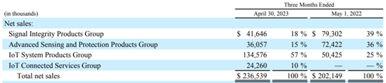 根据Semtech的一季度财报,2023年2月1日-4月30日,该公司营收总额为2.36亿美元,其中1.36亿美元来自并购的Sierra Wireless合并而来。收购Sierra Wireless后,该公司的业务线分成信号完整性部门、高级保护和传感部门、物联网系统产品部门以及物联网连接服务部门4个核心部门。其中,物联网系统产品部门是从此前LoRa事业部和Sierra Wireless的模组产品、路由器部门组成的,是当前Semtech最大的业务部门,第一季度营收占总营收比例达到57%;物联网系统产品部门则是由Sierra Wireless的连接托管平台和LoRa云平台组成的,其营收占比为10%。这两个部门组成Semtech物联网业务主体,整体占比达到67%,而去年物联网业务比例仅占25%。