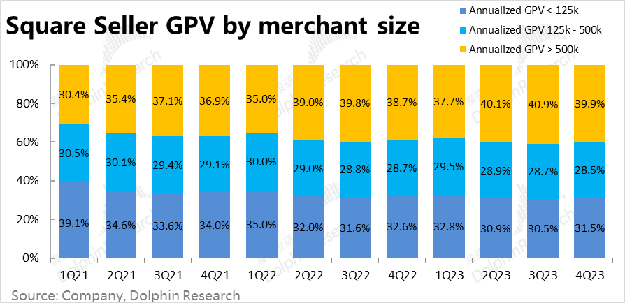 Square板块目前的战略方向之一 –发展中等规模以上商家的进展上,本季年支付额高于50万美元的商家占比为39.9%,同比提升了1.2pct,在稳步推进中。