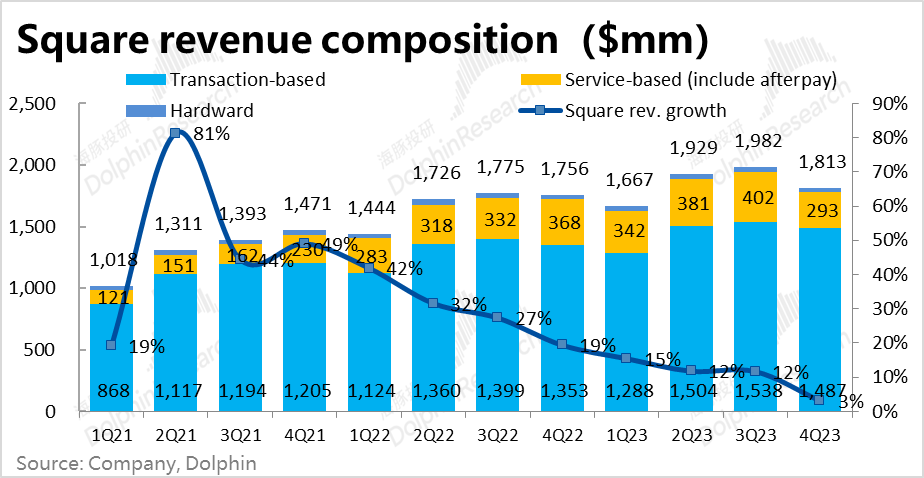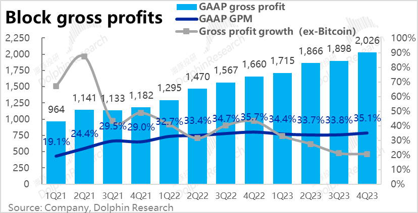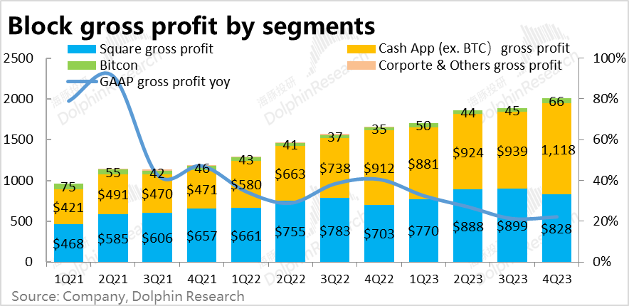 2、剔除比特币业务后,Cash App板块实现毛利润11.2亿美元,增长了23%,较上季放缓4pct,高于市场预期11%,不过也主要是因为Afterpay口径变更影响;
