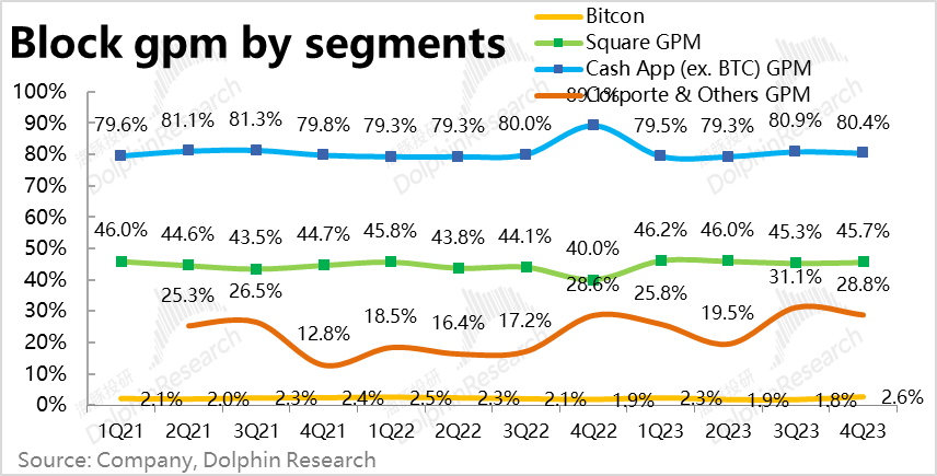2、Cash App稳步增长:剔除比特币业务后,Cash App板块实现营收13.9亿美元,高于预期的12.6亿,预期差也主要是由上述口径的变更导致。