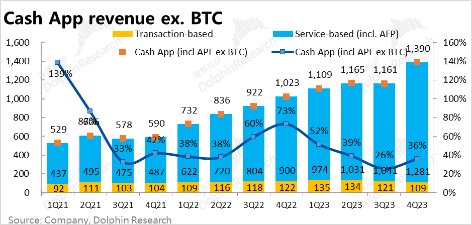 本季剔除比特币业务后,Cash App板块实现营收13.9亿美元,高于预期的12.6亿,也是主要因为前文提及Afterpay 100%归入Cash App的口径变更导致的。