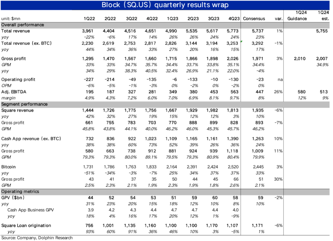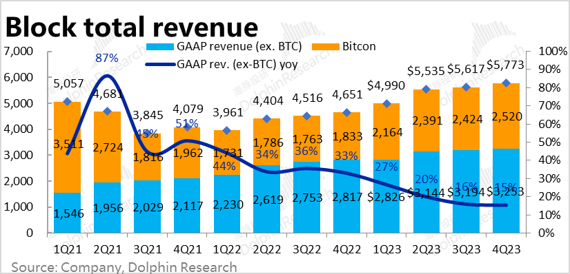 3、整体业绩还算不错:剔除口径变更导致Square和Cash App可互相对冲的预期差,本季Block整体营收57.7亿美元,同比增长了15%,和市场预期基本一致。剔除比特比业务,核心收入为32.5亿,同比增长15%,和预期也基本一致。
