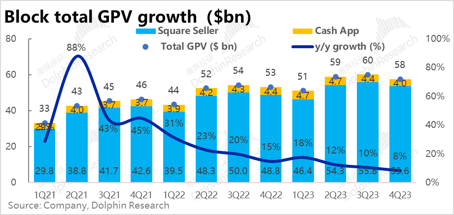 但是,另一关键经营指标—通过Square生态实现的支付金额 (GPV) 为536亿美元,同比增长了10%,增速放缓2pct。通过Cash App完成的C2B支付额为40亿美元,同比下滑9%,两者合计低于市场2%,同样表现不算好。