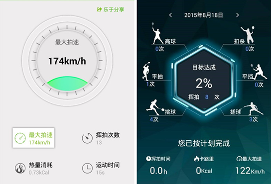 登录APP后可以看出,usense的界面较为简单,仅有最大拍速、热量消耗、挥拍时间及次数等参数,而酷浪小羽的界面要丰富很多,除了上述参数之外,还统计出了各种击球动作的频次分布。