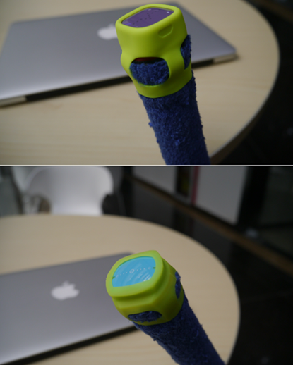 我们先从安装开始,酷浪小羽和usense都提供了两种安装方式,即3M胶安装和硅胶套安装,略有不同的是,usense是通过3M胶将一个卡座贴在球拍底端,然后装上传感器,而酷浪小羽则是直接将传感器贴在球拍底端。