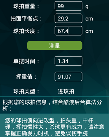 另外,酷浪小羽的APP里有一个“挥重测量”的功能,根据官方给出的步骤可以测量出球拍的挥重,由于一个专业挥重仪要好几千块,我们无法实测,只能拿论坛数据做比较:用酷浪小羽测出nr-zsp挥重为91.07,论坛给出的数据是90到92之间,精确度不错。