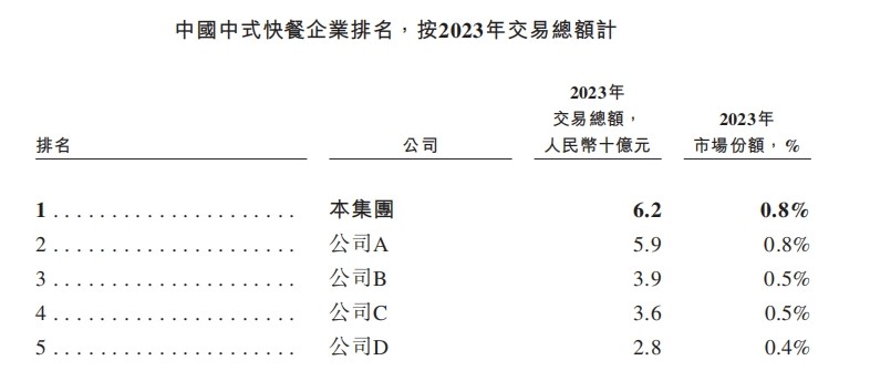 老乡鸡在招股书中自称在中国中式快餐行业位列第一,但事实上,这个头衔更多源自其门店规模和交易总额的相对领先,而非品牌壁垒或模式稀缺性。因为,中式快餐行业本就集中度极低,据灼识咨询数据,2023年中国中式快餐行业前五大企业合计市占率仅为3%,老乡鸡以0.8%的份额居首。这背后的“暗语”是,行业尚未跑出真正的龙头,也未形成稳定护城河。