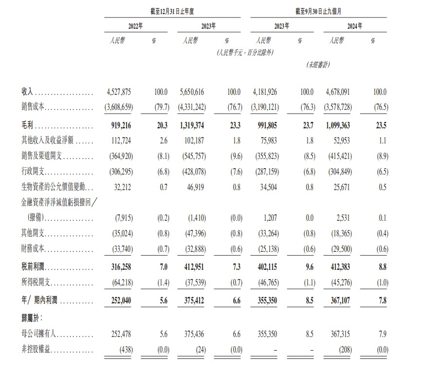 先来看营收和利润。招股书披露,2022年老乡鸡营收为45.28亿元,2023年增长至56.51亿元,2024年前三季度达46.78亿元。净利润表现上,2022年为2.52亿元,2023年提升至3.75亿元,2024年前三季度为3.67亿元。