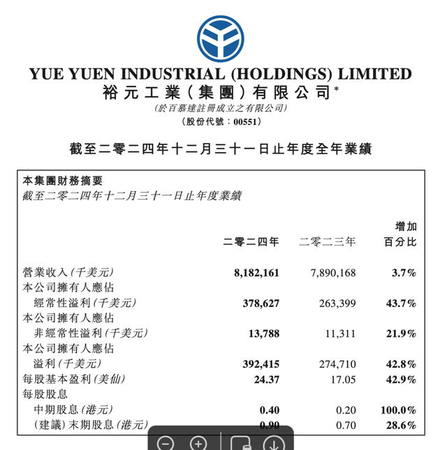 2024年,裕元集团实现收入81.82亿美元,同比增长3.7%,实现归母净利润3.92亿美元,同比增长42.8%。