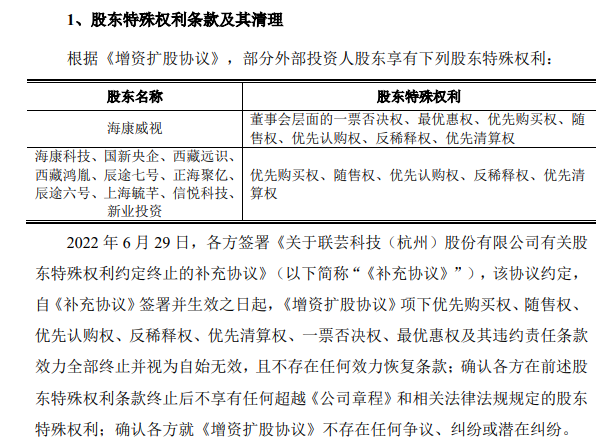 发行前,海康威视及其子公司海康科技是联芸科技的第二大、第三大股东,持股比例分别为22.43%和14.95%。据悉,海康威视作为联芸科技股东曾享有董事会层面的一票否决权、最优惠权、优先购买权、随售权、优先认购权、反稀释权、优先清算权等股东特殊权利。