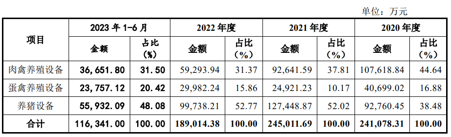 按照业务划分,大牧人的主营业务可分为肉禽养殖设备、蛋禽养殖设备和养猪设备三大板块。其中,肉禽养殖设备的收入由2020年的10.76亿元降至2021年的9.26亿元,又进一步下滑至2022年的5.93亿元,为该公司收入规模下滑的主要原因。