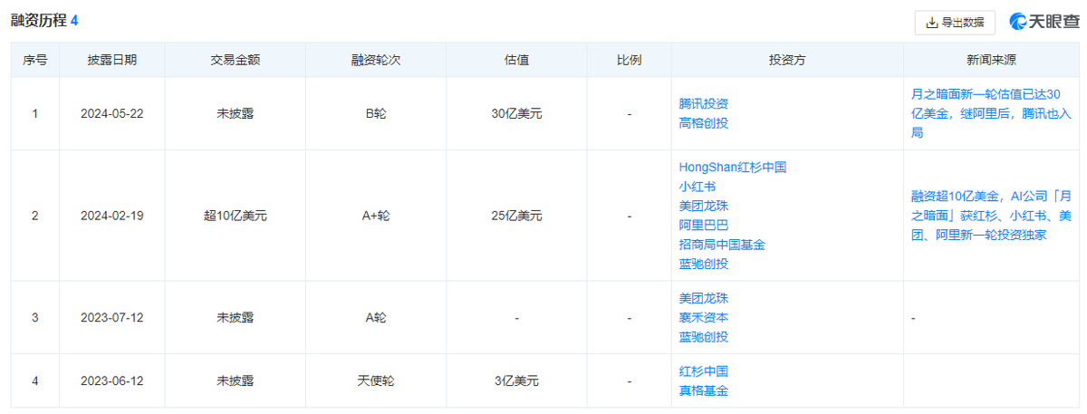 而据天眼查,在今年2月,该公司就已获得超10亿美元融资,估值达到约25亿美元。据悉,此次创下了国内大模型领域单笔融资纪录,参与其中的就有阿里巴巴、小红书等互联网企业以及老股东红杉中国、砺思资本等。
