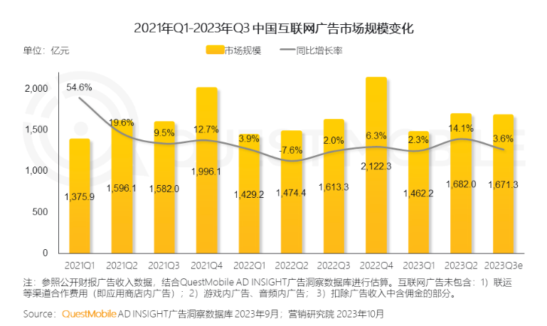 另一方面,与游戏产业遇冷类似,因缺少购物节、假日经济等利好因素,2023年三季度,国内广告市场增长也开始放缓。QuestMobile披露的《2023中国移动互联网秋季大报告》显示,三季度我国互联网广告规模同比仅增长3.6%,不及Q2增速的零头。