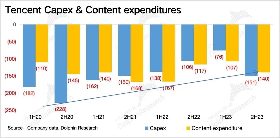 在这个前提下,腾讯将比往年多出来的“闲置资金”,主要用在了扩大回购规模,同时也减少借款净增加(多为海外投资时的美元贷款,借少还多),而其他现金用途,比如与主业间接相关的资本开支、内容采购规模变化不大,并未随着收入增长而同步扩张。