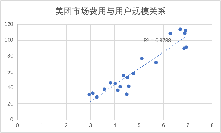 上图中我们用美团交易用户与市场费用进行拟合处理(R2接近0.9,有效性非常之高),可以非常确切看到两组数据保持着高度的正相关性。从近期交易用户的增长来看,一直徘徊在7亿左右,用户增速已经放缓。