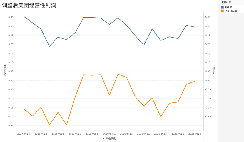 对毛利分析之后,我们再考虑美团经营性利润的表现。与赴美上市中概股相比,在港上市的美团经营性利润会计准则有所不同,本文我们将美团经营性盈利进行调整:总收入-成本-市场费用-管理费用(港股是将金融资产损益,公允价值计量且变动计入损益的金融投资等都计入经营性利润的,美股则没有),见下图