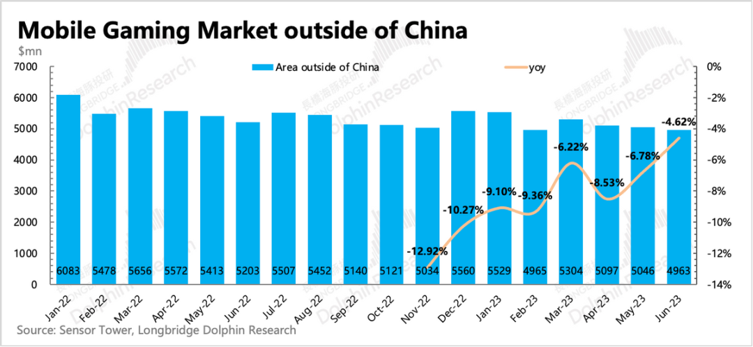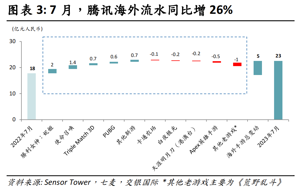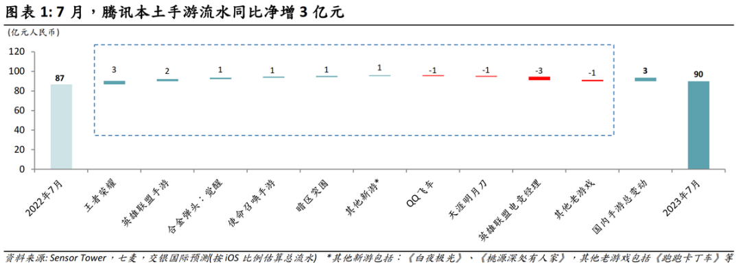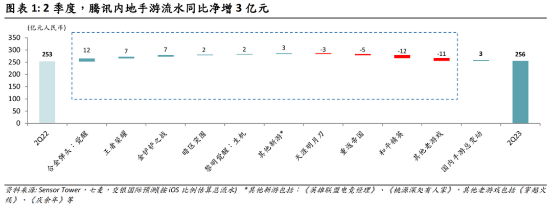 细分来看,主要是本土游戏拖了后腿,同比持平,而Q1增速有6%,也显著低于行业16%的增长水平。二季度的疲软应该主要源于老游戏(《天涯明月刀》、《和平精英》)继续下滑以及《王者荣耀》年初冲高回落减弱了同比增速,此外就是与腾讯新游上线不多以及网易(《蛋仔派对》、《逆水寒》)、米哈游(《崩坏:星穹轨道》)分别有重磅游戏上线有关。腾讯二季度上线的新游中只有《合金弹头:觉醒》流水还不错,预计贡献了5%。