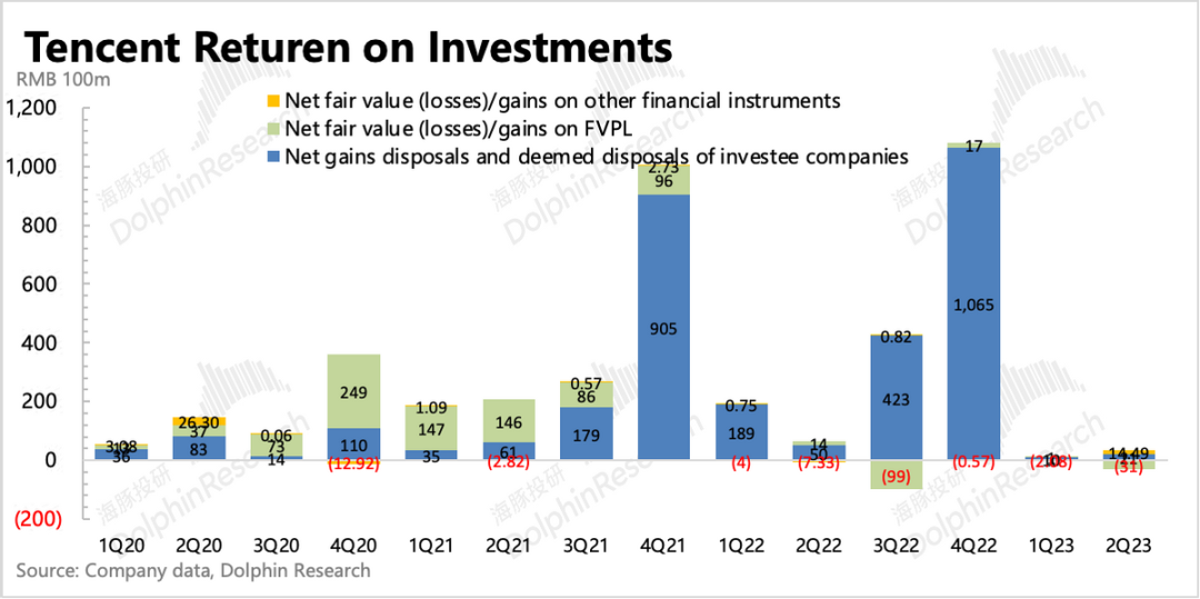 二季度腾讯主业以外的投资性收益不多,其中分占联营/合营盈利12亿,相比一季度的1亿,环比提升明显,说明兄弟公司在降本增效之后利润都开始加速反弹。但部分以公允价值计量的资产价值缩水了31亿,抵消了上述的分占盈利以及其他金融工具的投资收益。