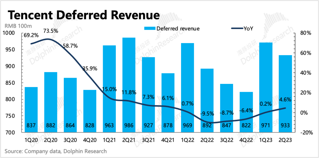 展望三季度以及下半年,海豚君认为需要谨慎调低预期,但也不必过于悲观。低基数、新品密集上线以及海外游戏市场的复苏,都望托底下半年的游戏增长。除此之外,二季度的递延收入也并没有同步萎缩,流水上应该还算稳定,只是用户实际购买消耗的速度变慢。