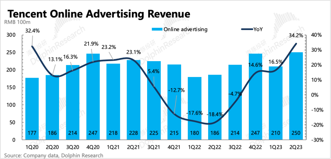 二季度腾讯的广告收入又一次大超预期,尽管市场预期已经并不低了,单季实现收入250亿,同比增长34%,其中视频号贡献了30亿。二季度数字广告整体行业也在低基数下加速增长,但显然腾讯更加受益。