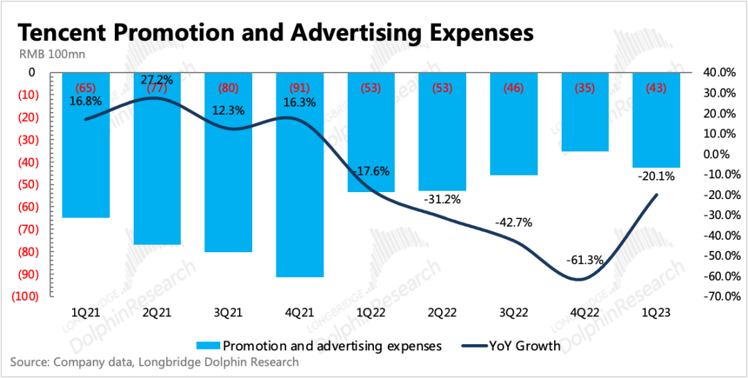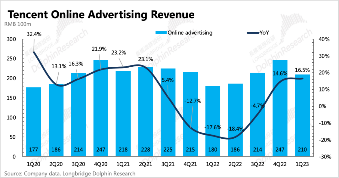 (2)广告修复、扩张趋势不改,短期要求别太高。一季度广告同比增长16.5%,达到210亿,虽然市场原本有更高的期待,毕竟去年四季度就有15%的增长了,并且年初以来,广告主对视频号的高认可度也一直频频传出。因此尽管上季报电话会上公司给的指引也就是15%,但市场仍然在近一个月不断上调预期,使得最终实际收入出来,有2pct的差距。但海豚君认为,单看腾讯自身,一季度增速并不差。