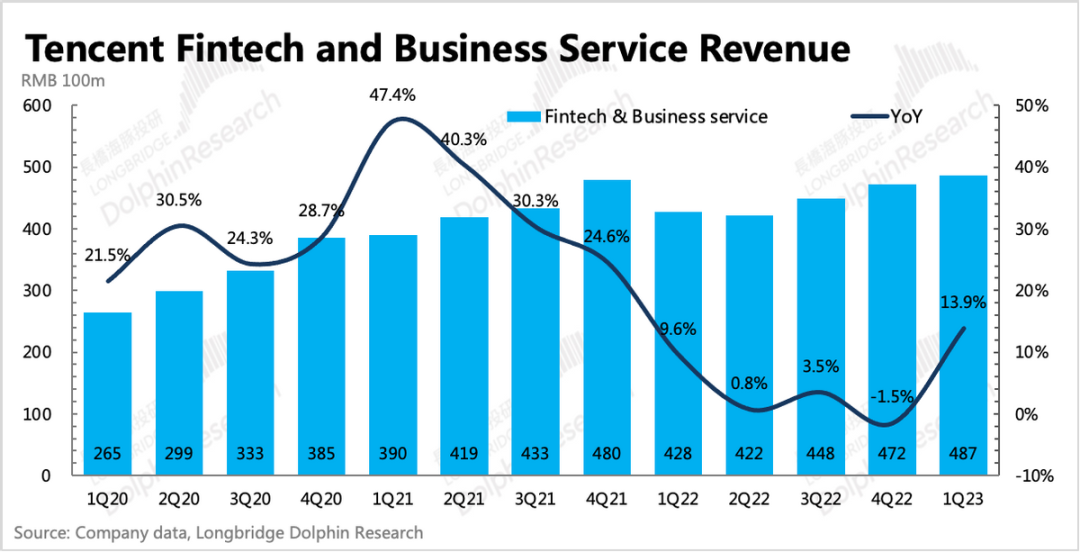 (3)金科业务预期内走修复,云业务还在调整,但影响加速缩小,一季度同比增长14%,超市场预期。疫情放开,线下活动恢复,自然会使得微信支付的交易场景回流。云业务虽然还未完全调整结束,但海豚君估算下来,已经加速接近尾声,很可能不需要等到明年,而在今年下半年就能看到恢复正增长。