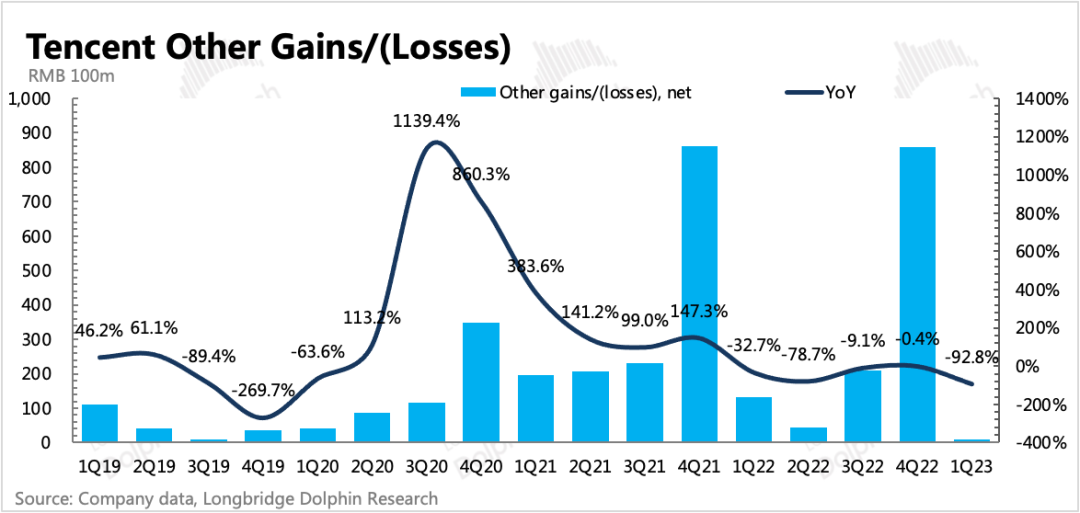 一季度没有大额度的投资性资产处置情况,因此其他收益明显回落。但一个亮点是,分占联营/合营公司收益已经时隔两年后正式扭亏。这个变化,背后体现的是腾讯系投资公司,甚至可以扩大到整个互联网行业,都已经走在降本增效的道路上。