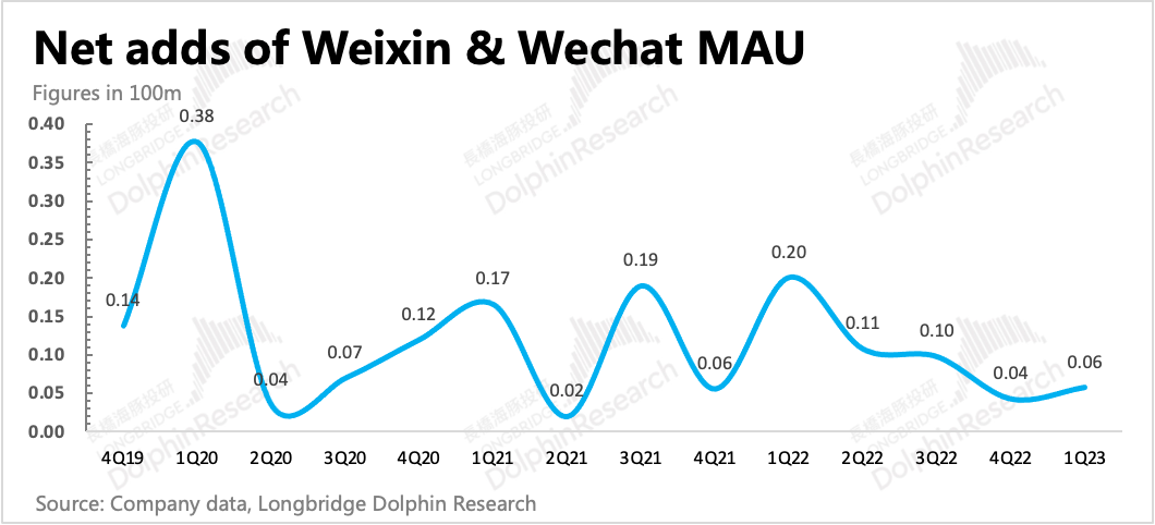 一季度微信保持稳健,单季净增600万人,但相较以往环比增速有所下滑,或许预示着天花板的临近。截至3月末月活达到13.19亿。从第三方数据来看,微信用户总时长增速有明显放缓。除了用户有可能见顶外,年初由于春节和线下出行的火热,日常工作学习场景更多的微信,活跃度自然会有回落。