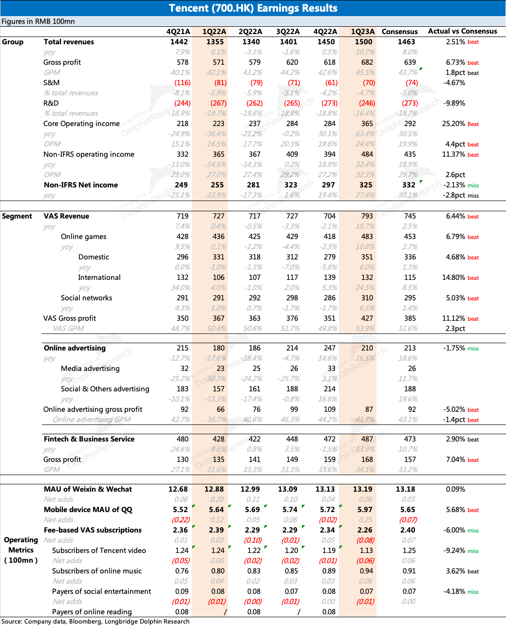 大家好,我是长桥海豚君!北京时间5月17日港股盘后,腾讯控股(700.HK)发布2023年一季度财报。总的来说,乍一看好像这次鹅厂利润不及预期,但海豚君细扒下来,股王还是一如既往的稳健,提效后带来的利润释放实际上是超出预期的可观: