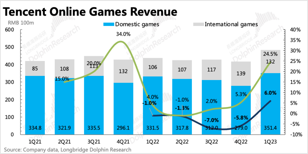 一季度网络游戏收入483亿元,恢复同比增长11%,其中本土游戏市场同比增长6%,海外同比增长25%,海外游戏收入占比27%。无论是本土还是海外,重回加速增长趋势。