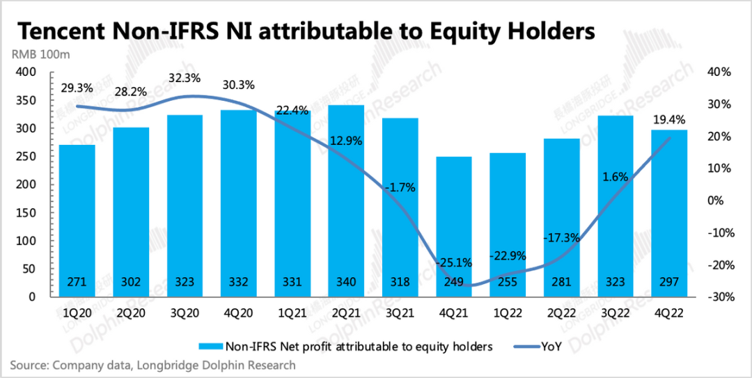 当然如果按照腾讯官方的调整后利润——即增加了分占联营/合营公司的损益,以及利息收入等其他非主营收入项,同时剔除了投资收益、减值拨备以及无形资产摊销变动影响的Non-IFRS归母净利润,一季度则是同比增长27%达到325亿,比市场预期的332少了7亿。造成主业利润与Non-IFRS表现较大差异的原因,来源于旗下海外公司一次性调整确认的递延所得税增加,导致最终集团整体支出的税费比正常税率情况下要多50亿。