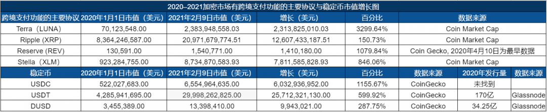 表2:2020–2021加密市场有跨境支付功能的主要协议与稳定币市值增长图