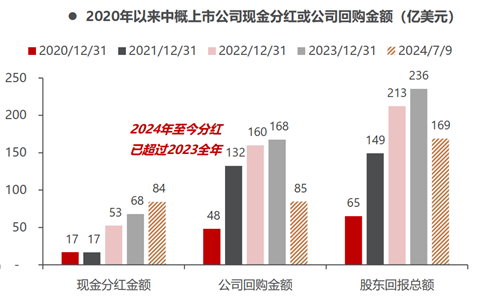 而作为老牌互联网企业的阿里巴巴,近两年同样在股东回报上,下足了功夫,将经营现金流基本全部通过回购和分红的方式回馈了股东:2023年,阿里的股东回报是121亿美元,2024年,阿里的股东回报更是有可能达到150亿美元左右。根据民生证券统计的全部中概上市公司股东回报数据,可以看到在转型之后的2021年开始,中国互联网公司就开始了注重股东回报,2021年超出2020年1倍多,后续两年继续增长,而2024年仅上半年,股东回报就达到169亿美元,已经达到去年的72%。