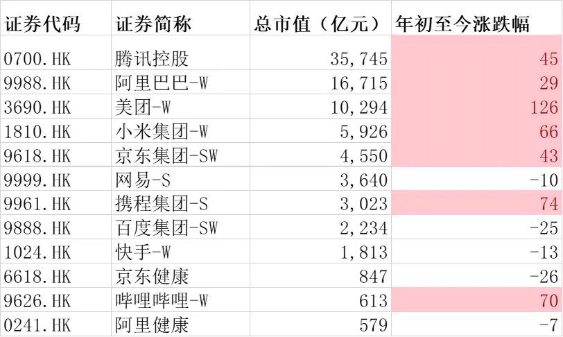 但这一轮的行情完全不同2020年的鸡犬升天下的行业普涨,分化相当大。我们统计了恒生科技指数中市值前12名的互联网公司,走出了明显的分化。涨幅大的公司,股价上涨了50%以上,而不少公司,年初至今还是负收益。
