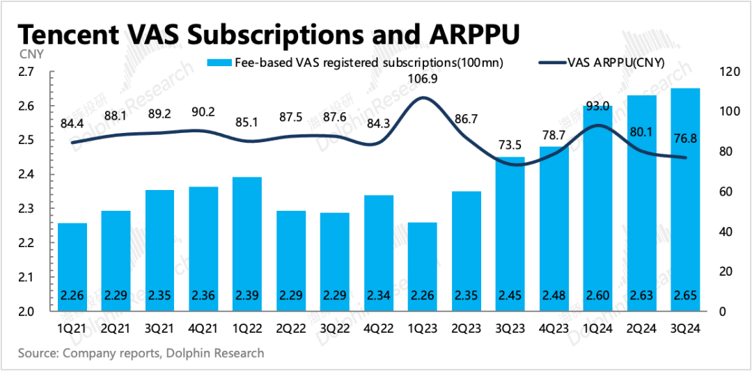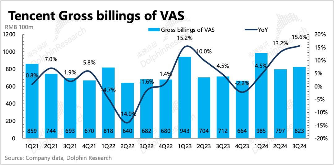 海豚君认为,主要存在两方面原因,1)新游戏虽然表现不错,但《王者荣耀》等超头部老游戏,暑期表现一般。从Sensor Tower数据显示,7-9月《王者荣耀》iOS端流水同比存在5-10%的下滑。2)暑期用户活跃度较高,当期充值当期就购买道具消耗掉了。这从我们计算的流水指标可以看出,三季度整体增值服务流水环比增长3%,符合往期正常年份季节波动趋势。因此由此预期在去年底基数下,Q4游戏还有持续性增长。