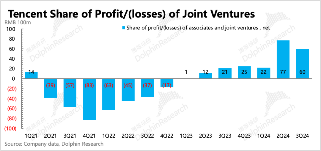 2)三季度分占联营/合营公司盈利60.19亿,主要体现腾讯投资但不控股的兄弟公司们三季度盈利情况。比如拼多多、快手等。但三季度这部分利润今年环比有下降,因此一定程度上也体现了大环境对被投公司带来的经营压力。