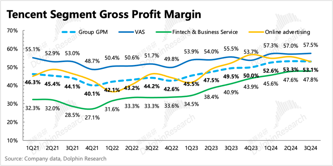 不过站在长期视角,海豚君还是认为腾讯的杠杆效应还没完全发挥出来。不仅仅是体现在超10万人的组织优化上(成熟业务的人效比并不高),还体现在同一产业链上下游各项业务之间的联动,减少集团层面的摩擦成本,以及AI新技术的变革,从而带来的整体提效。