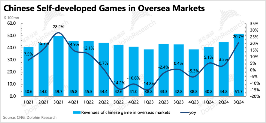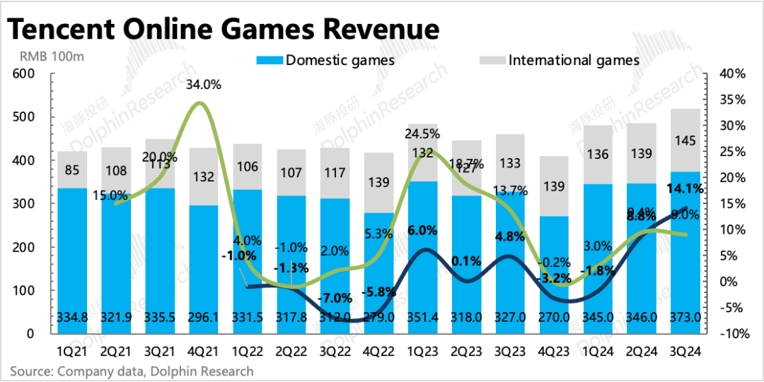 国内本土市场增长14%,时隔三年终于回到两位数增速,但也不算超预期。增长动力主要就是新游戏,核心的主要就是《地下城与勇士手游》、《无畏契约》以及《三角洲行动》,老游戏中《和平精英》在暑期加大了商业化,延续了二季度的好转,因此对三季度本土游戏增长也有一个推动。