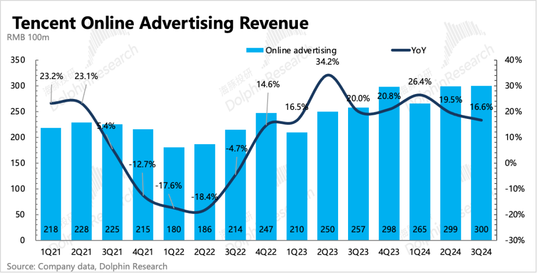 我们都知道,近两年,随着视频号和小程序游戏的先后崛起,在同时面对逆境的腾讯,广告业务是存在alpha逻辑的。但同时随着低基数的数字效应减弱,纵有视频号和小程序,也难敌越来越严峻的环境影响。因此,虽然三季度腾讯的广告收入同比增速还有16.6%,符合市场预期。但市场也在为接下来的压力而担忧。