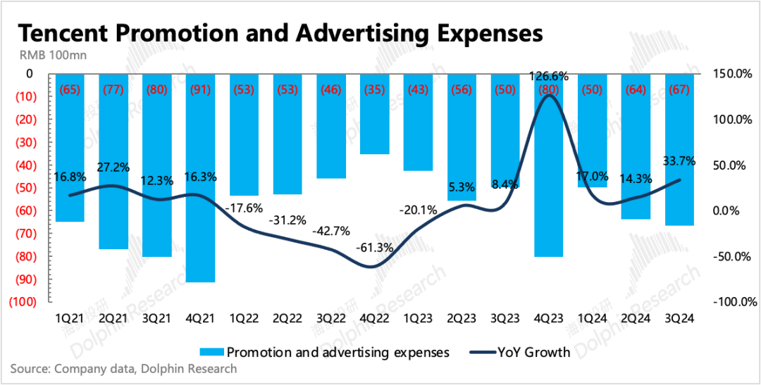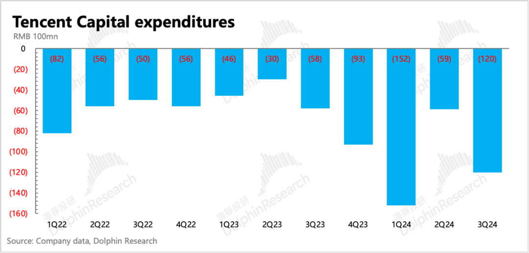海豚君加了一个问号,这一点我们还需要根据电话会再做确认。三季度腾讯的三项经营费用都是正增长,其中推广费用、研发支出增加得相对明显。推广费用的增长与新游戏密集上线有关,研发费用拆分来看,服务器带宽增速高于员工薪酬。再加上资本开支这个季度又增加至120亿,因此我们猜测大概率是与AI相关的投入带来。