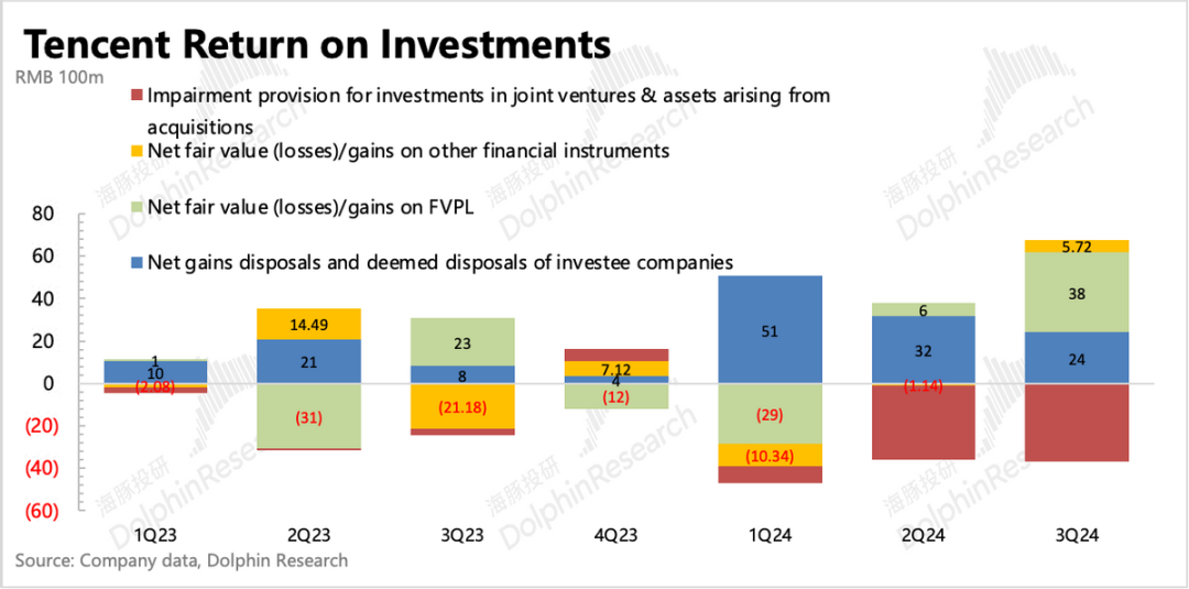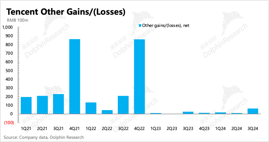 资产处置收益三季度还有24亿,说明腾讯的在持续做投资组合的优化。结合年初以来公司表明的投资组合所需资金基本内部解决,不会再去动用投资业务之外的资金。回购压力+对AI等新技术的不缺位投资,可能会继续促使腾讯保持高于去年的投资性资产处置。