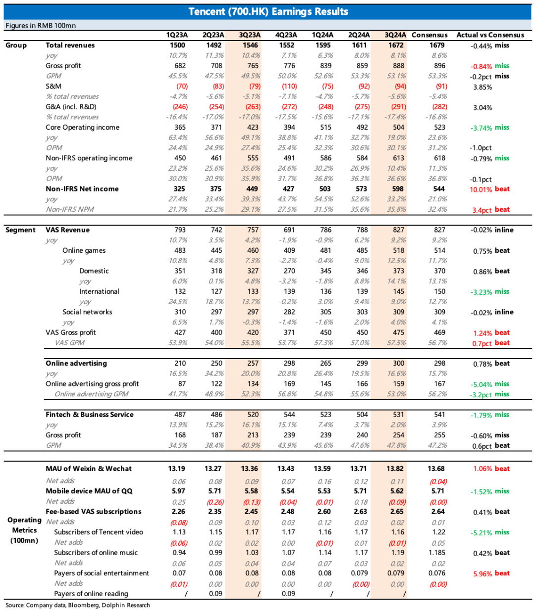 腾讯控股于北京时间11月13日港股盘后发布了2024年三季度。看上去炸裂的利润表现,实际并未超预期,只能说,在三季度这样的宏观环境下,股王要想扎扎实实的beat高预期,实在是太难了!