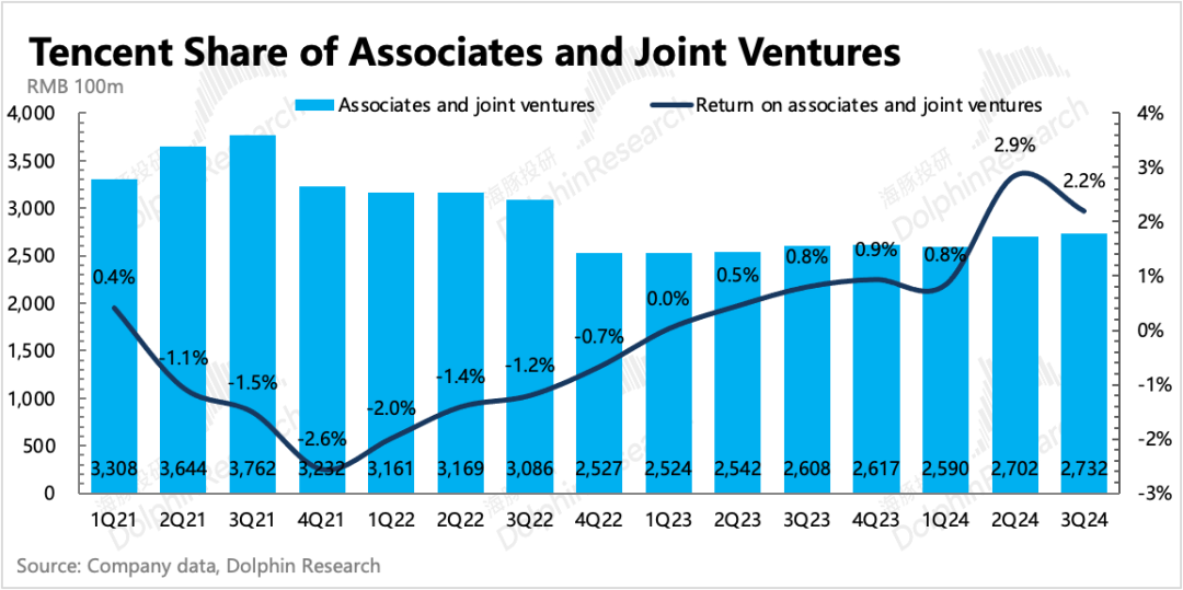 截至三季度末,公司联合/合营资产规模合计2732亿,结合当期分占盈利60亿,计算得三季度腾讯的投资收益率为2.2%,环比略有下降。