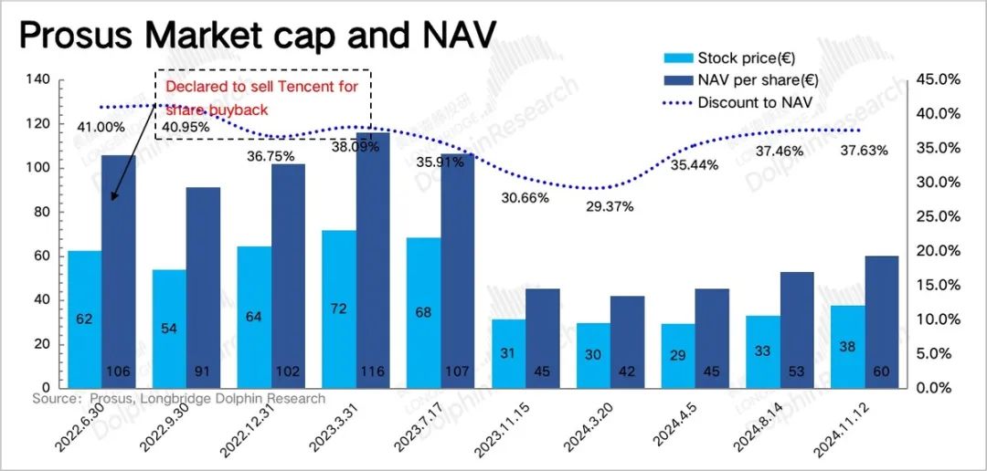 相比我们在8月的统计,大股东Prosus 在8月14日至今3个月内抛售了3400万股,考虑有台风天的扰动,因此抛售节奏基本持平。但因为腾讯回购注销力度更大,因此截至三季度末,大股东持股比例变化不大,仍有24.1%,其净资产/股价=62.4%,也就是折现率为37.6%,相比二季度基本相差不大。