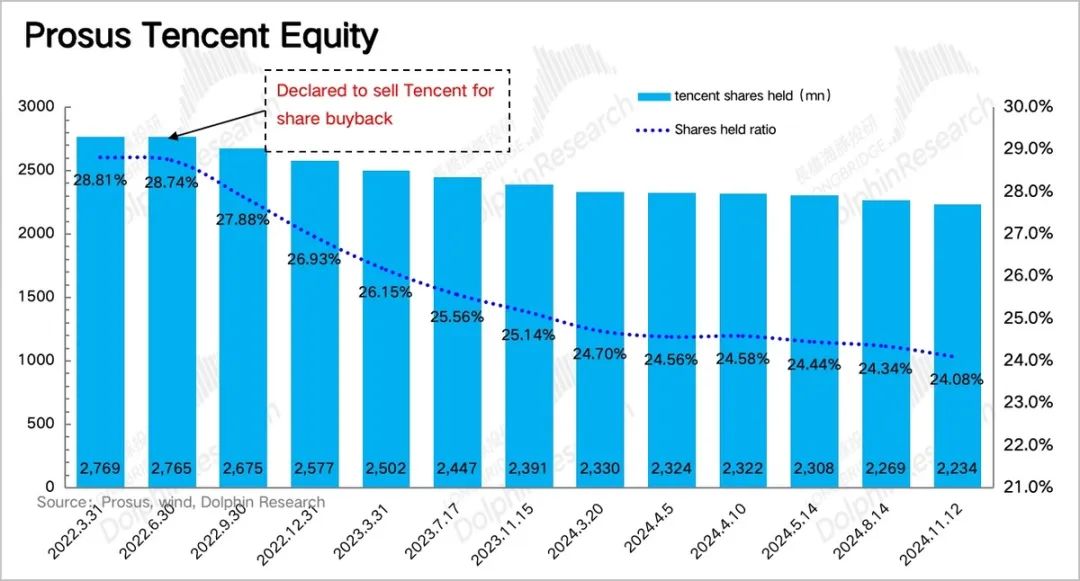 不过大股东仍在默默减持,从上季度统计的8月14日至昨天11月12日,Prosus 3个月内抛售了3400万股,相比上个周期平均月抛售节奏继续小幅度放缓(或有台风天交易所闭市的影响)。但因为腾讯回购注销力度一直都比抛售更大(8-11月同期净减少了4138万股),因此截至三季度末,大股东持股比例变化不大,仍有24.1 %,环比上季度只小幅下降了0.25%。