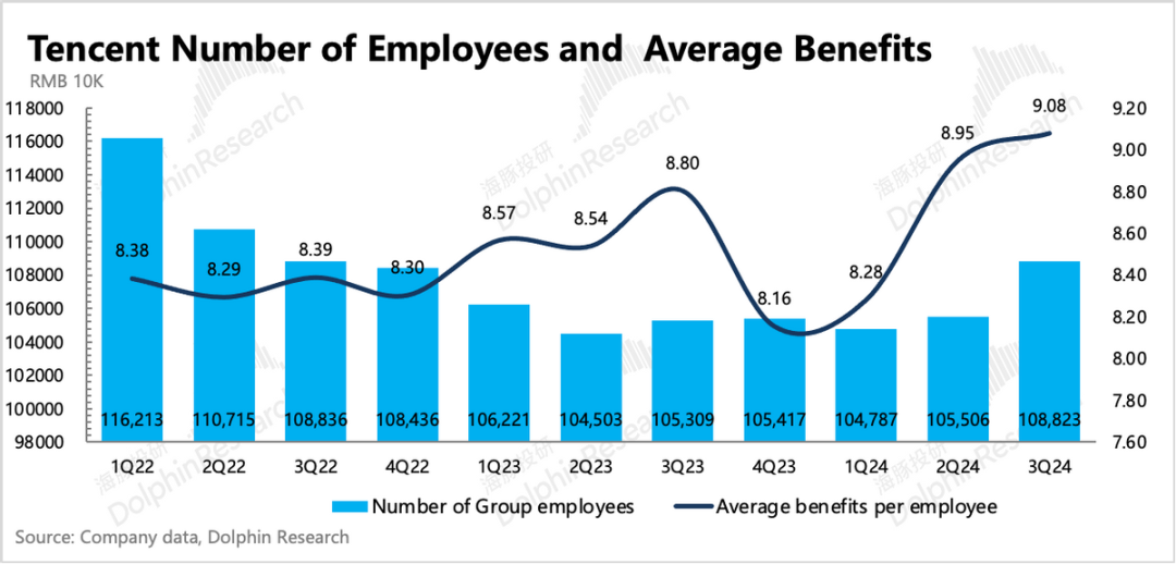 与此同时,集团总员工人数环比增加了3300人,相比前两年,三季度似乎又重新扩张的迹象。这一点实际上是出乎海豚君意料之外的,虽然管理层在前两个季度电话会上提及要对部分看好的领域积极投入(比如AI、海外游戏、视频号),但单季一下子增加这么多人,还是有点夸张,且与近期新闻报道的游戏高管裁员的消息也相左。