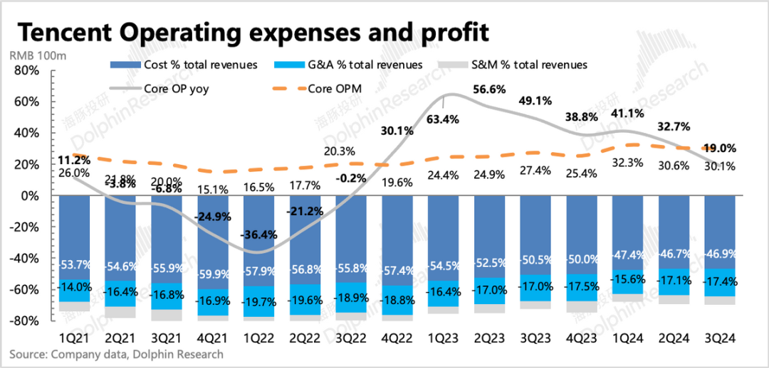 毛利润上,三季度整体并没有继续环比改善。一方面,三季度虽然游戏收入显著改善,但因为DNFM给到Nexon的分成较高,因此这款新游的利润率并不高,对三季度增值服务毛利率的拉动作用很有限。不过增值服务中,腾讯音乐为代表的子公司,毛利率应该维持稳定或小幅提高。因此最终增值服务毛利率环比值提升了0.5pct。