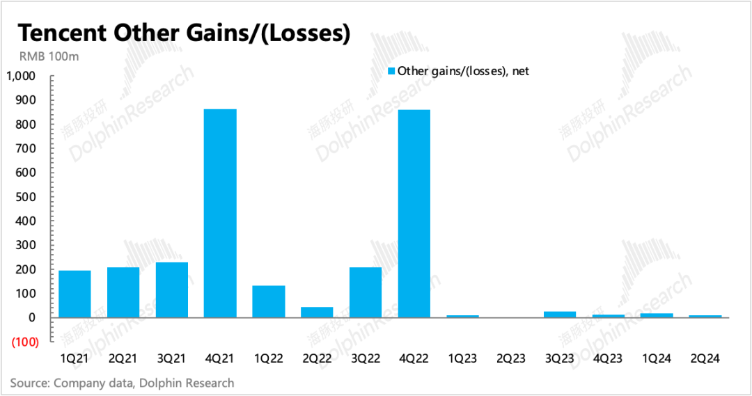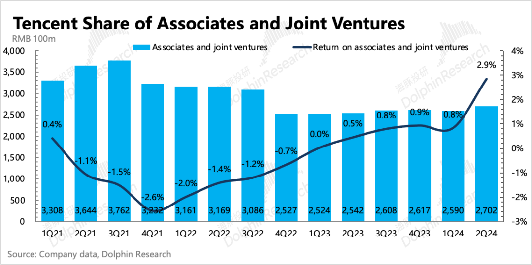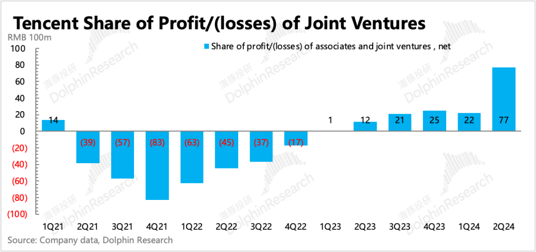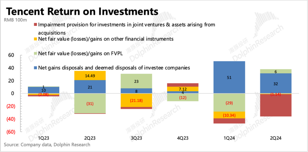 关于投资利得,海豚君基于原指标定义,主要看其他收益净额(按照原定义,包含投资收益),以及分占联营/合营公司盈利两个部分来看:1)其他收益净额8.65亿,资产处置依旧不低,但资本市场的动荡导致投资公司的减值当期也不少。资产处置收益在年初明显增加后,二季度虽有放缓,但仍然存在显著增长。结合上季度公司表明的投资组合所需资金基本内部解决,不会再去动用投资业务之外的资金。回购压力+对AI等新技术的不缺位投资,可能会继续促使腾讯保持高于去年的投资性资产处置。如果单独看投资性资产自身增值带来的收益,保持略微正收益的状态,主要来自处置加快的动作,公允价值虽有增加,但Q2季末国内资本市场行情很快又回落,因此公允价值增幅较小。