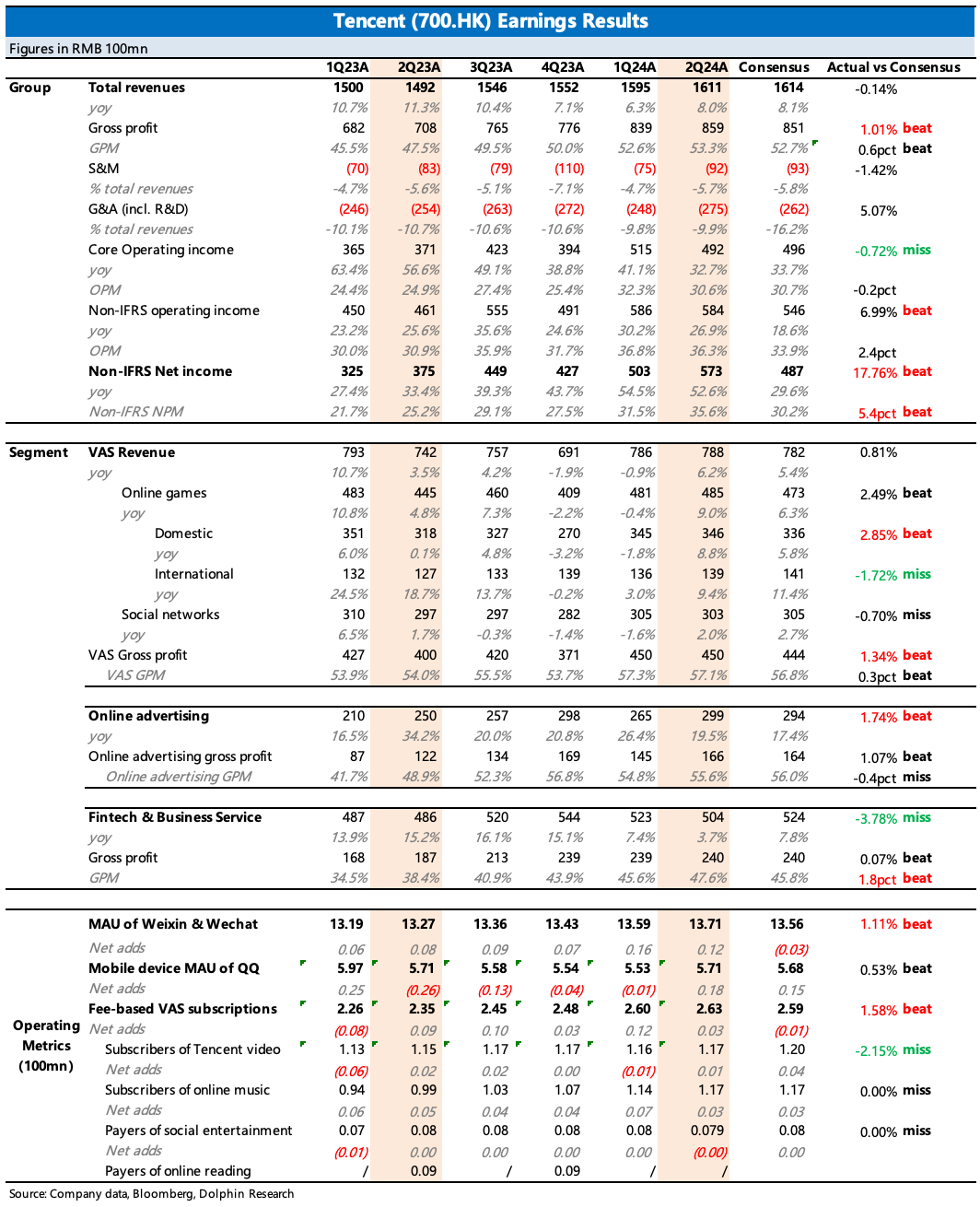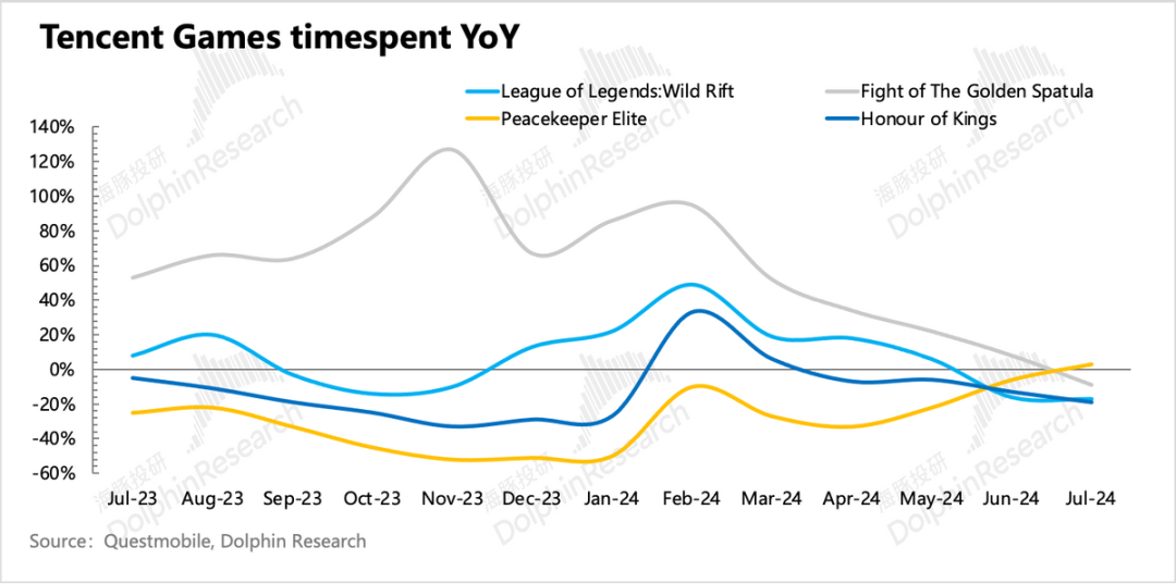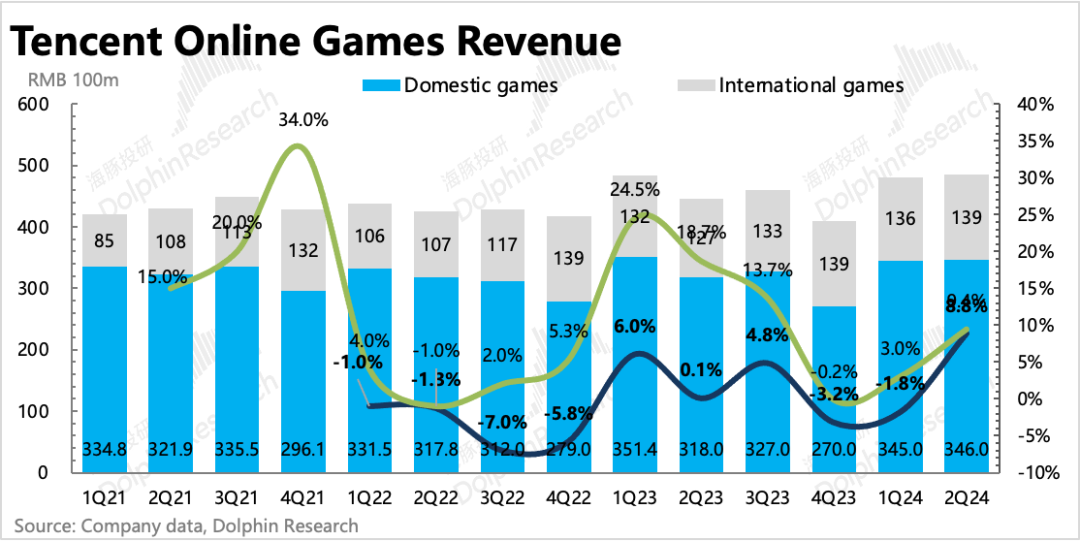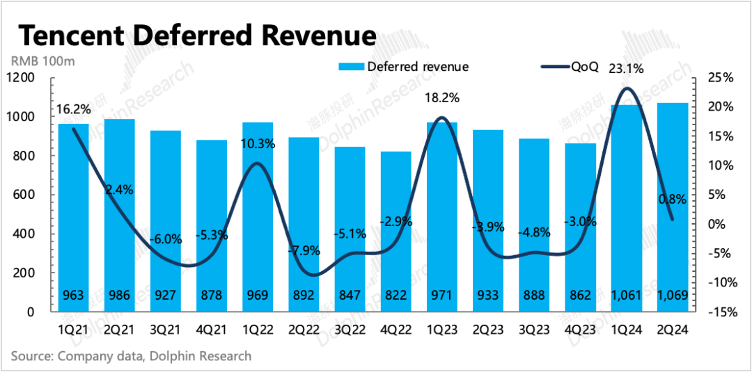 上季度游戏回暖迹象已有体现,再加上DNFM霸榜数月,因此市场预期也并不低。实际本土表现比我们原先设想得更好,同比增长9%,而市场大多落在5-8%。海外市场虽然有表现优异的《Squad Busters》继续贡献增量,但并未达到市场预期的增幅。从递延来看,Q2同比加速修复,但环比持平。海豚君认为Q2虽有王炸级别的DNFM上线,但碍于Q2本身是淡季(递延环比走低是惯例)、行业压力(同比下滑)、DNFM仅贡献一个月流水等原因,这个递延表现也并不是不能接受。而从7、8月目前的畅销榜排名来看,DNFM持续位居第一,以及和平精英的持续回暖,因此对递延表现也不必过于介怀。当然中长期下还需要持续的优质新品,以及对老游戏的运营创新。这都是过去几年腾讯表现欠佳的能力,尤其是前者。因此建议继续持续关注公司对游戏业务进一步调整以及Pipeline更新。