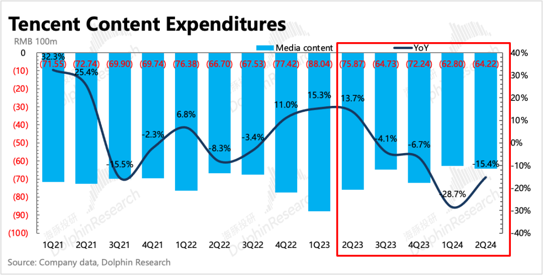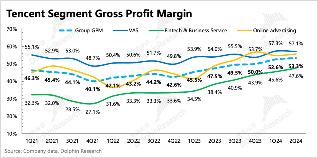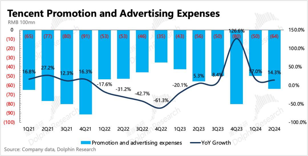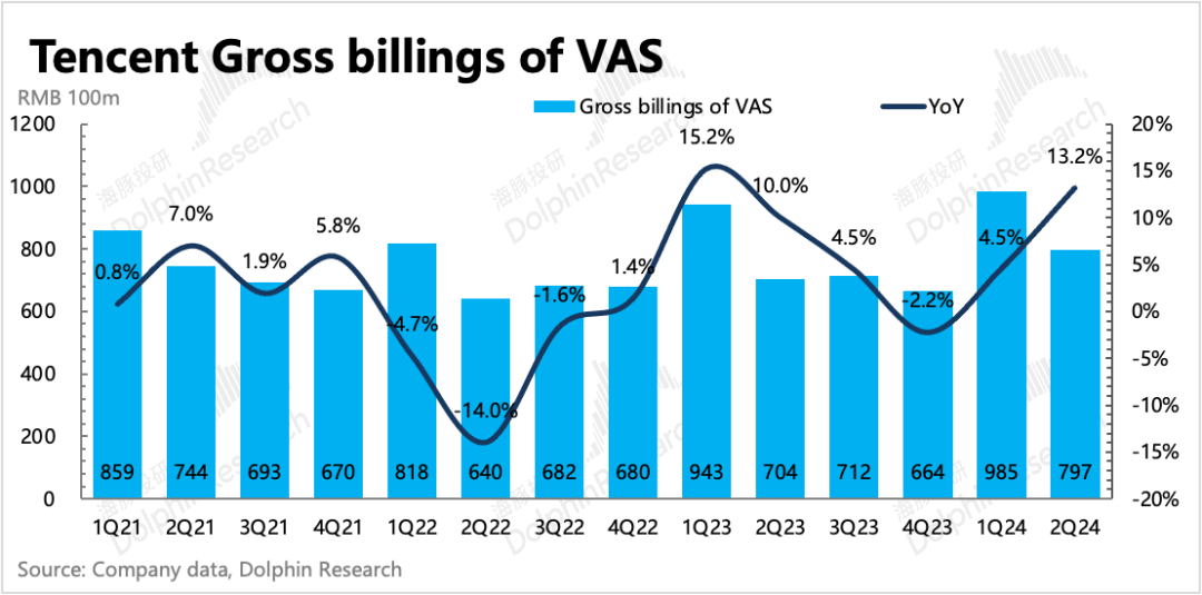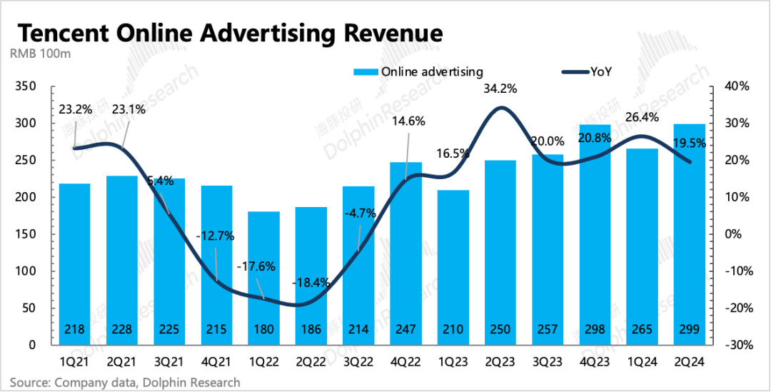 二季度腾讯的广告收入同比增速维持20%,高基数下,较一季度26%的增速自然放缓。虽然放缓,但在持续疲软的宏观消费环境下,这个表现已然不错。